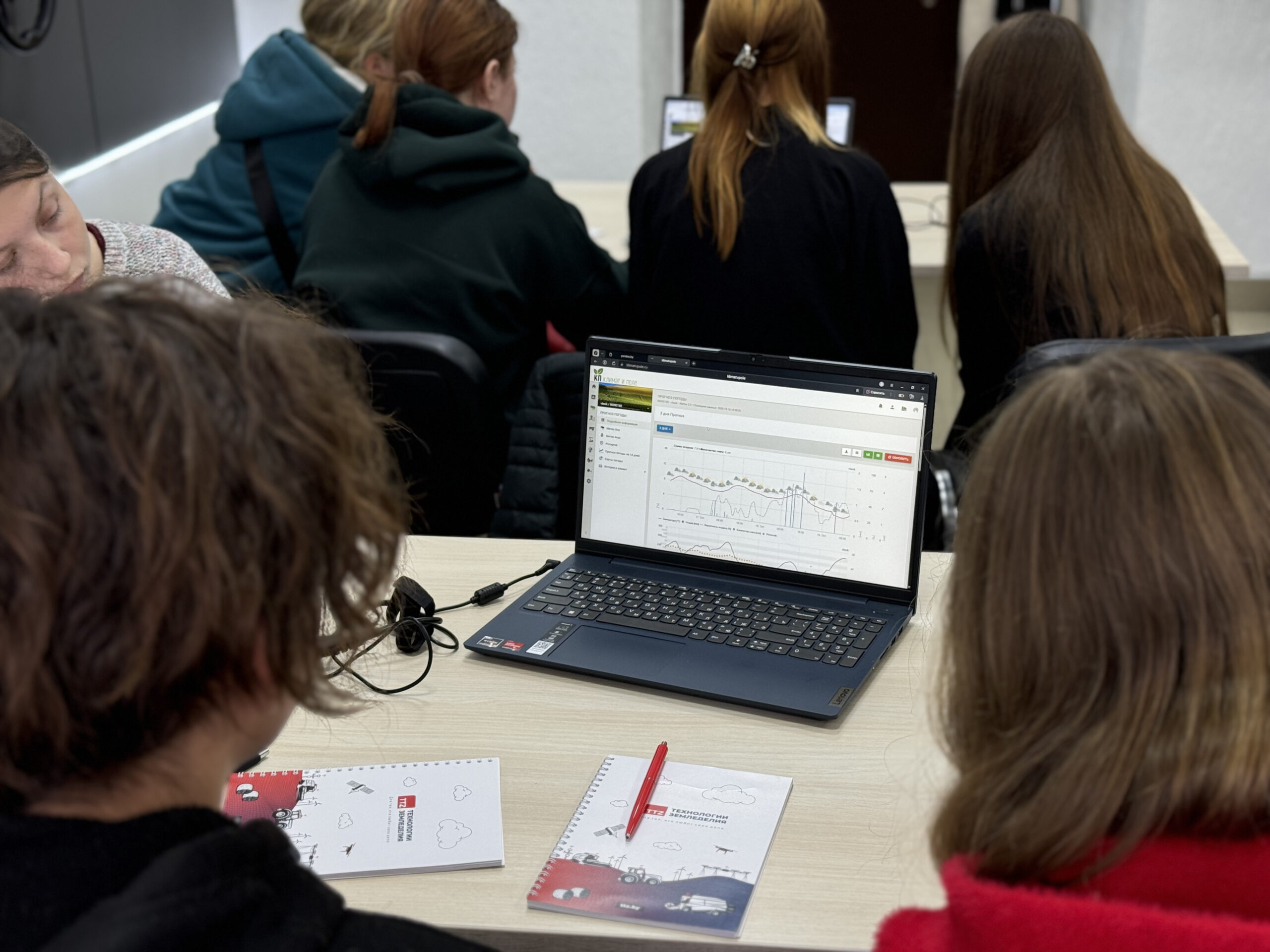 Во время практической части ребята работали с программным обеспечением метеостанций, решали прикладные агрономические задачи и анализировали реальные производственные данные, что позволило им наглядно увидеть, как цифровые инструменты помогают принимать эффективные решения в управлении посевами.